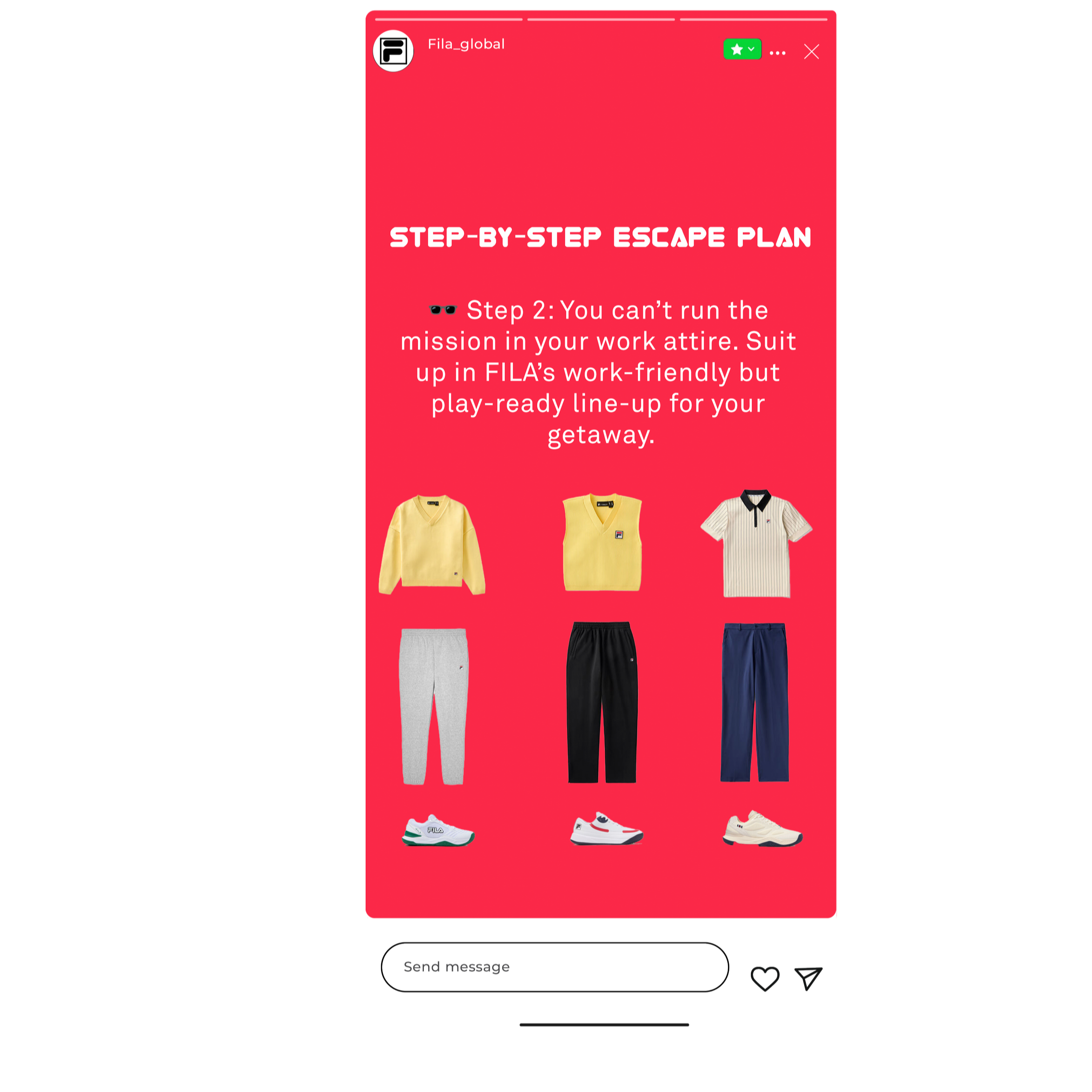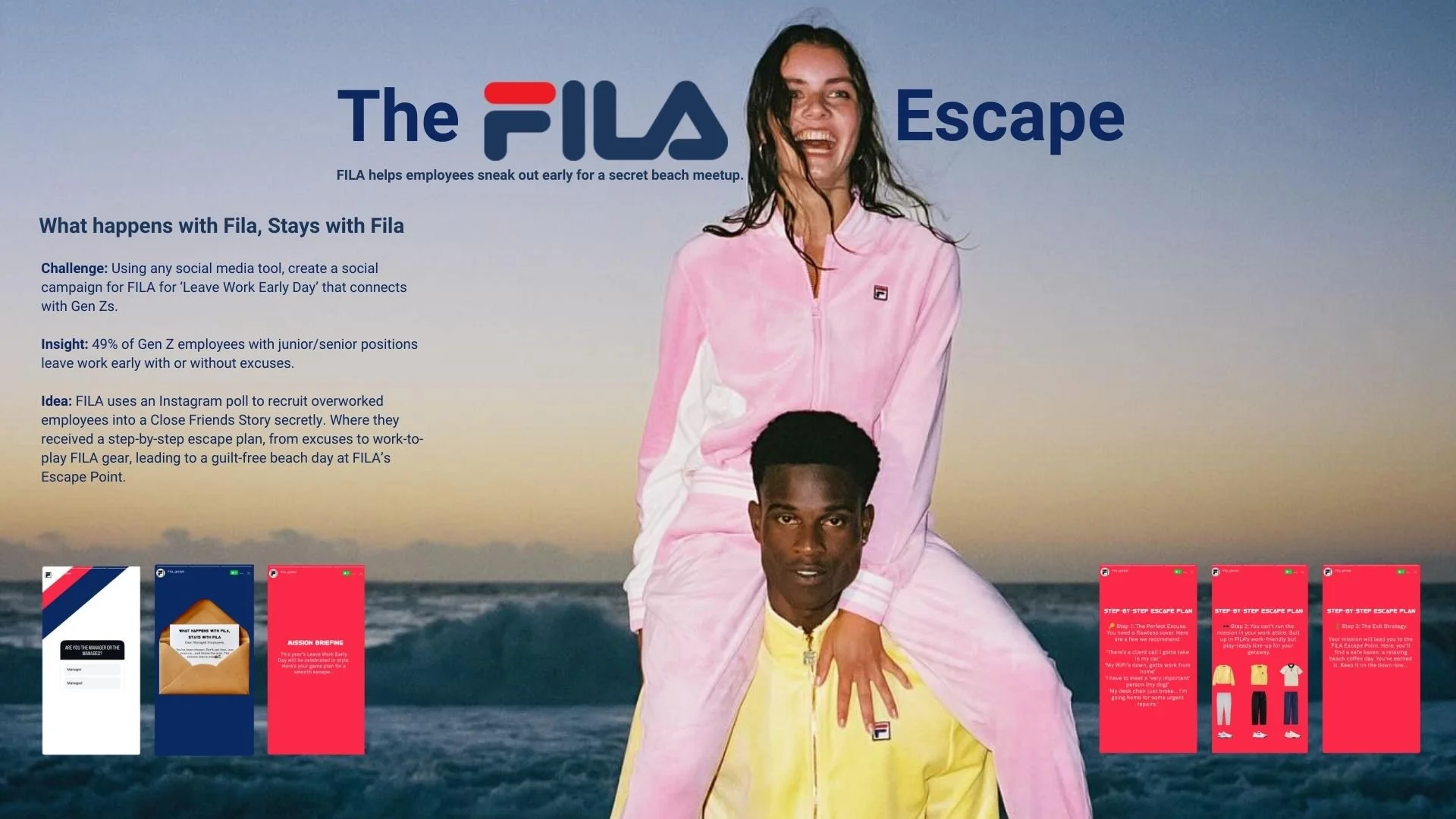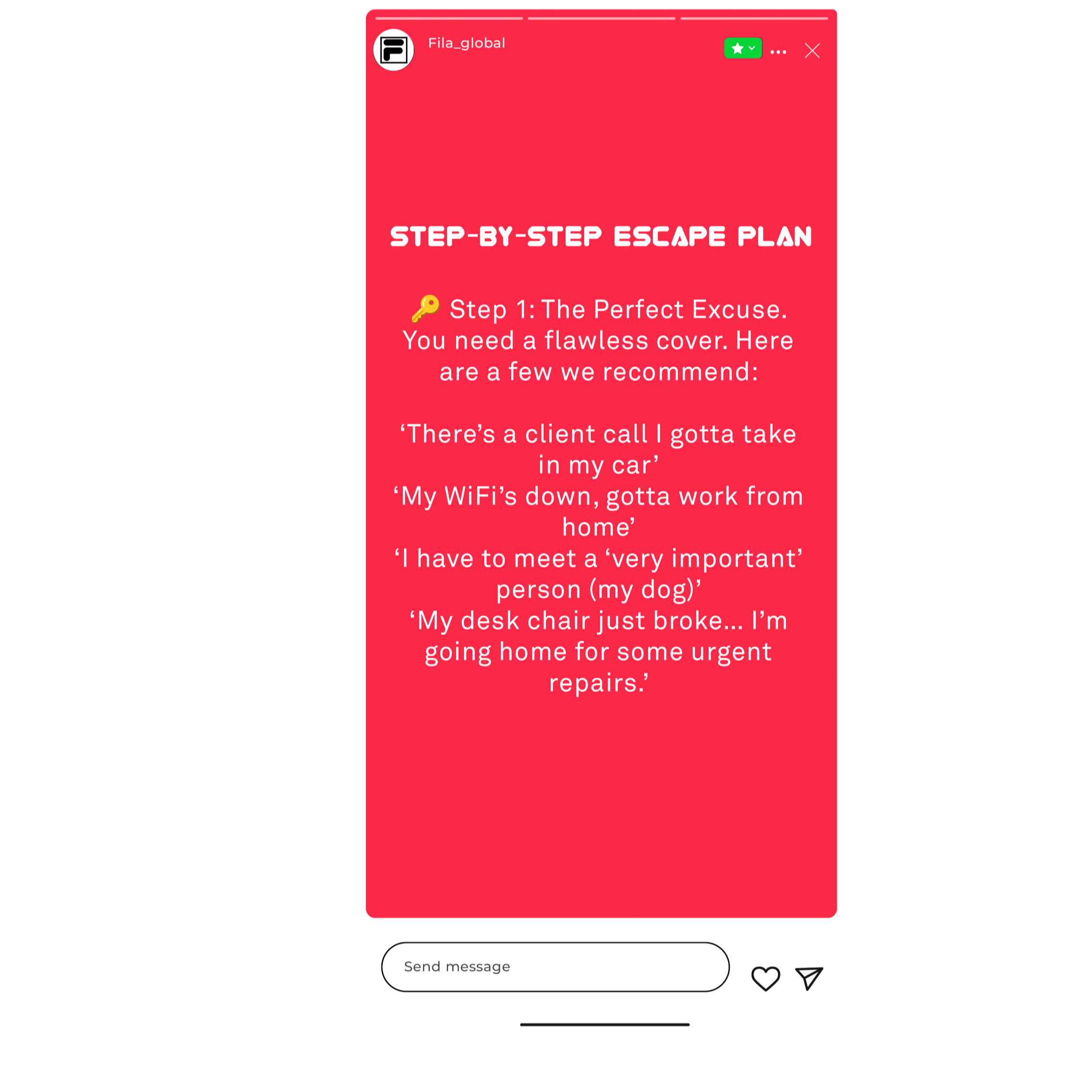 With an Instagram poll, Fila identified the "managed" employees and secretly added them to a Close Friends list on Instagram. There, they received a step-by-step escape plan, from crafting the perfect excuse to switching into FILA’s work-to-play gear. A final “Are you in?” poll sealed the mission. Those who accepted? They executed the plan flawlessly, ditching work for a relaxing, guilt-free beach day at FILA’s Escape Point.